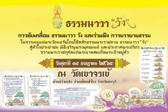 ทั้งนี้กิจกรรมปูทางตื่นรู้ สู่ธรรมนาวา วัง ที่จัดขึ้น เพื่อเผยแพร่ตามหลักธรรมคำสอนพระพุทธศาสนา ธรรมนาวา วัง ตามแนวทางพระราชดำริ หลักธรรมไปสู่การพ้นทุกข์ของพระพุทธองค์ และนำไปปรับใช้ในชีวิตประจำวันในทุกมิติอีกด้วย