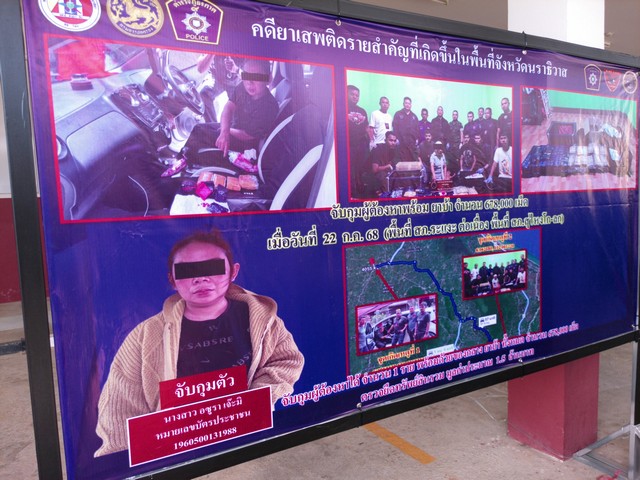 จึงได้ประสานกับหน่วยงานที่เกี่ยวข้องเข้าทำการตรวจสอบ บ้านเช่าซึ่งมีลักษณะเป็นแหล่งซุกซ่อนยาเสพติด ในพื้นที่ อ.สุไหงโก-ลก จ.นราธิวาส ผลปรากฏพบของกลางยาเสพติด (ยาบ้า) จำนวนประมาณ 670,000 เม็ด เจ้าหน้าที่ตำรวจชุด ขยายผลฯ จึงแสดงตัวเข้าจับกุมพร้อมแจ้งข้อกล่าวหาให้ผู้ถูกจับกุมทราบว่ามีความผิดฐาน “จำหน่ายยาเสพ ติดให้โทษประเภท 1 (ยาบ้า) โดยการมีไว้ในครอบครองเพื่อจำหน่ายเป็นการกระทำเพื่อการค้า และก่อให้เกิดการแพร่กระจายในกลุ่มประชาชน และเป็นการทำให้เกิดผลกระทบต่อความมั่นคงของรัฐหรือ ความปลอดภัยของประชาชนทั่วไป พร้อมยึดของกลาง ประกอบด้วย ยาบ้า 678,000 เม็ด รถยนต์เก๋ง ยี่ห้อ Nissan สีขาว ป้ายทะเบียน งน 6560 สงขลา 1 คัน โทรศัพท์มือถือยี่ห้อ Oppo Reno 8 จำนวน 1 เครื่อง และจับกุมผู้ต้องหาได้จำนวน 1 ราย คือ น.ส.อซูรา (นามสมมุติ)และอยู่ระหว่างการรวบรวมพยานหลักฐานเพื่อขออนุมัติศาลออกหมายจับบุคคลที่มีส่วน เกี่ยวข้องอีกจำนวนหลายราย และรวมยึดทรัพย์สินตาม พรบ.ยาเสพติด มูลค่า1,500,000 บาท
