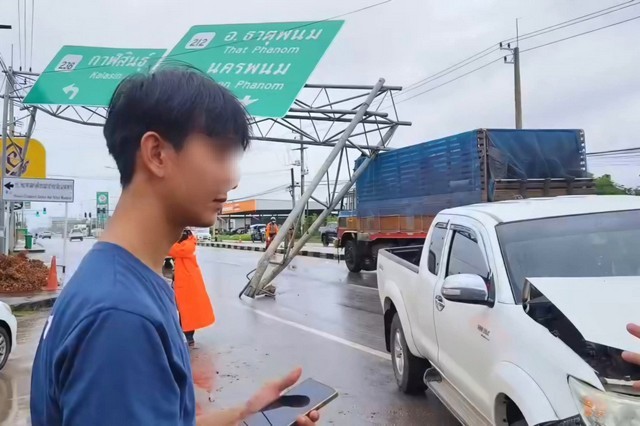 จากการตรวจสอบเบื้องต้น พบว่าเสาป้ายบอกทางที่ติดตั้งบนเกาะกลางถนน ถูกแรงเฉี่ยวชนจนหลุดจากจุดยึดโครงเหล็กพาดล้มถูกท้ายรถบรรทุก Hino ทะเบียน 80-6974 สกลนคร ที่วิ่งมาจากตัวเมืองมุกดาหารมุ่งหน้าไป จ.สกลนคร ทำให้ไม่สามารถขับต่อไปได้ ส่งผลให้การจราจรติดขัด เจ้าหน้าที่ต้องประสานแขวงทางหลวงเร่งเข้าจัดเก็บและรื้อถอนโครงป้ายออกจากถนนยังเร่งด่วน