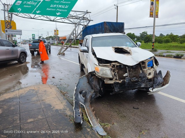 เมื่อเวลา 10.00 น. วันที่ 26 กรกฎาคม 2568 ร.ต.อ.ชันทอง อินทร์ผิว รองสารวัตร(สอบสวน) สภ.เมืองมุกดาหาร ได้รับแจ้งจากศูนย์วิทยุ ว่ามีอุบัติเหตุรถยนต์เฉี่ยวชนเสาป้ายบอกเส้นทางบริเวณถนนชยางกูร ขาออก มุ่งหน้าอำเภอธาตุพนม ใกล้แยกโคกสุวรรณ ตำบลมุกดาหาร อำเภอเมืองมุกดาหาร จึงรุดไปตรวจสอบยังที่เกิดเหตุ