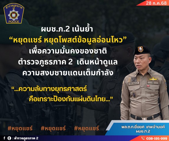 วันที่ 28 กรกฎาคม 2568 พล.ต.ต.ชัยต์พจน สูวรรณรักษ์ รอง ผบช.ภ.2 / โฆษก ภ.2 เปิดเผยว่า พล.ต.ท.ยิ่งยศ เทพจำนงค์ ผู้บัญชาการตำรวจภูธรภาค 2 (ผบช.ภ.2) แสดงความห่วงใยสถานการณ์ในพื้นที่ชายแดนไทย–กัมพูชา โดยได้กำชับทุกหน่วยในสังกัด ภ.2 ให้เพิ่มมาตรการดูแลความสงบเรียบร้อยทั้งในพื้นที่แนวหน้า และพื้นที่ชุมชนเมือง รวมถึงเน้นย้ำไปยังประชาชนทั่วไปให้ “หยุดแชร์ หยุดโพสต์ข้อมูลอ่อนไหว” ที่อาจกระทบต่อความมั่นคงของชาติ