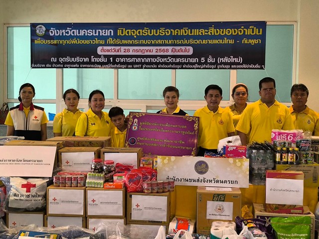 เมื่อเวลา 11.30 น.ของวันที่ 28 กรกฎาคม 2568 ที่อาคารศาลากลางจังหวัดนครนายก หลังใหม่ 5 ชั้นห้องโถงชั้น 1 นายชานนท์ วาสิกศิริ ผู้ว่าราชการจังหวัดนครนายก หม่อมหลวง พรรณะเลิศ วาสิกศีริ นายกเหล่ากาชาดจังหวัดนครนายก เป็นประธานในการเปิดศูนย์รับบริจาคเงินและสิ่งของจำเป็นเพื่อบรรเทาทุกข์พื่น้องชาวไทยที่ได้รับผลกระทบจากสถานการณ์ บริเวณชายแดนไทย – กัมพูชา โดยมีหัวหน้าหน่วยงาน ข้าราชการ องค์กรภาครัฐ ภาคเอกชน ผู้นำชุมชน และประชาชน ได้มอบเงิน ข้าวสาร อาหารแห้ง อาหารถกระป๋อง บะหมี่กึ่งสำเร็จรูป ผ้าอ้อมผู้ใหญ่สำเร็จรูป ยากันยุง และของใข้จำเป็นอื่นๆ ได้นำมามอบให้กับนายชานน วาสิกศิริ ผู้ว่าราชการจังหวัดนครนายก หม่อมหลวงพรรณะเลิศ วาสิกศิริ นายกเหล่ากาชาดจังหวัดนครนายก เพื่อนำไปมอบส่งต่อให้กับพี่น้องชาวไทยที่ได้รับผลกระทบบริเวณชายแดนไทย