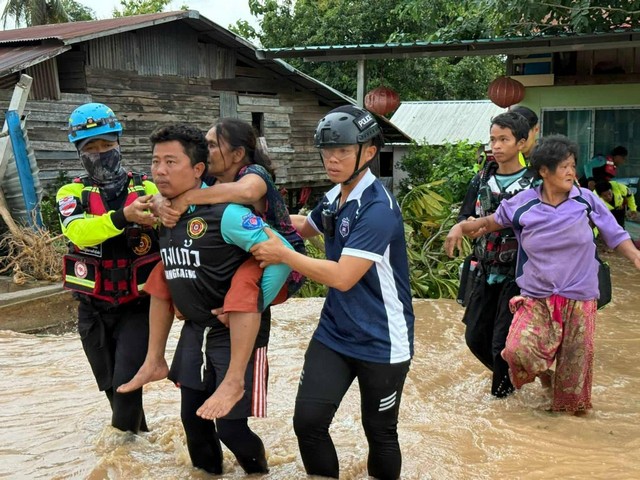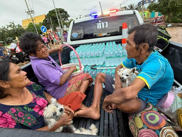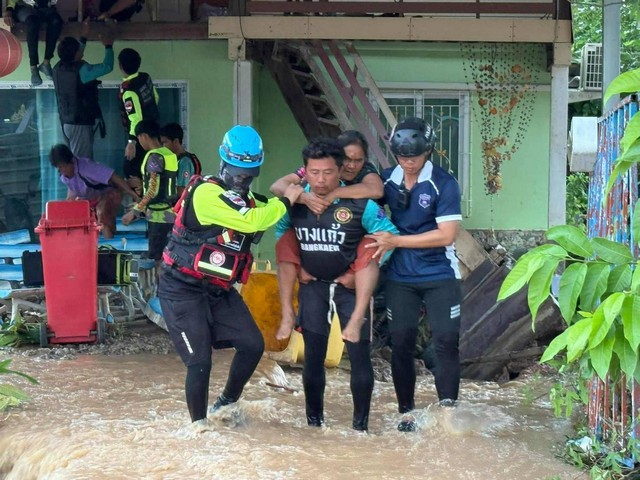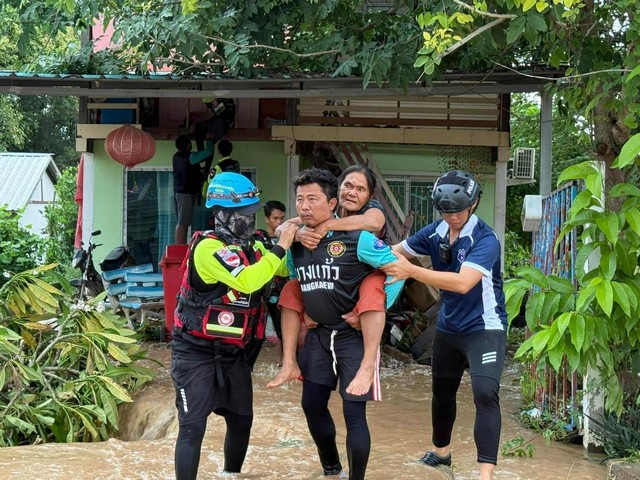 สุโขทัย กู้ภัยเร่งอพยบคนสัตว์ออกจากบ้านหลังถูกน้ำพัดจนทรุดเอียง บันใดบ้านเสียหาย