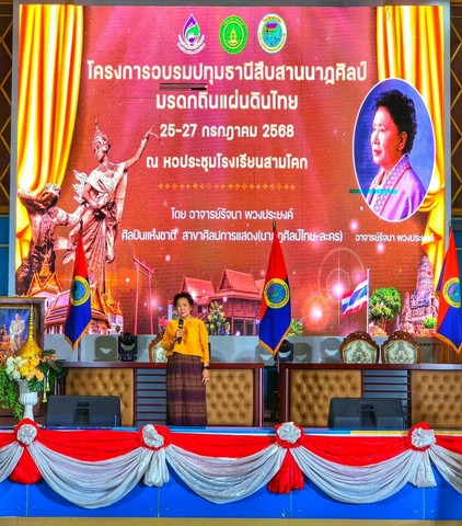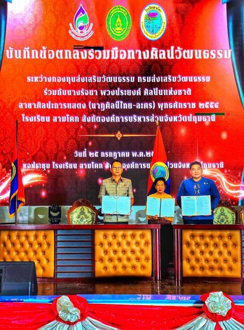 วันศุกร์ที่ ๒๕ กรกฎาคม ๒๕๖๘ เวลา ๑๓.๐๐ น. ณ หอประชุมโรงเรียนสามโคก นางนวลพรรณ ล่ำซำ (มาดามแป้ง) ประธานกรรมการกองทุนส่งเสริมงานวัฒนธรรม และนางยุถิกา อิศรางกูร ณ อยุธยา อธิบดีกรมส่งเสริมวัฒนธรรม ผลักดันให้มีการลงนามบันทึกข้อตกลงความร่วมมือทางศิลปวัฒนธรรม (MOU) กับนางรัจนา พวงประยงค์ ศิลปินแห่งชาติ สาขาศิลปะการแสดง (นาฏศิลป์ไทย-ละคร) พุทธศักราช ๒๕๕๔ และโรงเรียนสามโคก