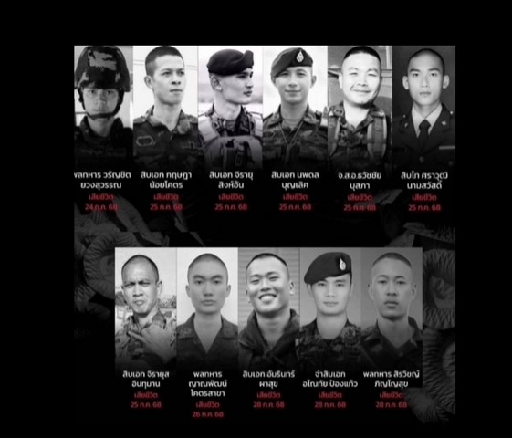 ขอแสดงความเสียใจกับครอบครัวทหารทุกท่าน ที่ได้สละชีพเพื่อปกป้องอธิปไตยของประเทศไทย และขอสดุดีวีรกรรมอันกล้าหาญของทหารหาญ ผู้ที่ได้เสียสละชีพในสมรภูมิไทย-กัมพูชา (ณ วันที่ 29 ก.ค.68)