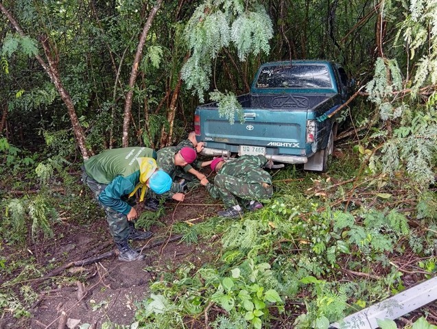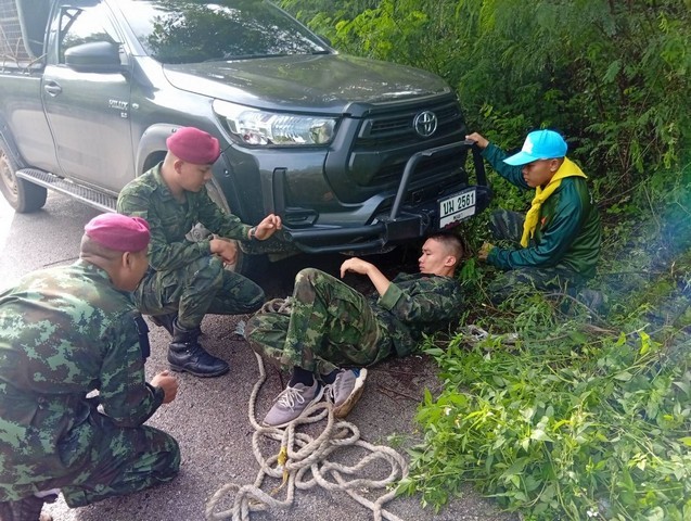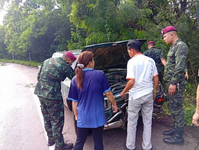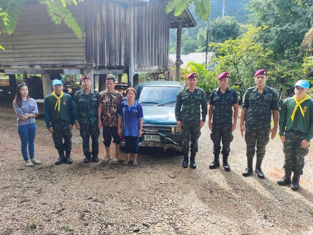 กำลังพลของหน่วย จึงได้ปฐมพยาบาลเบื้องต้น นางกอยฯ ได้แจ้งกับเจ้าหน้าที่ทหารว่า ขับรถมาจุดดังกล่าว รถเสียการควบคุมไถลลงข้างทาง เพราะเมื่อคืนมีฝนตกหนักถนนลื่น ช่างของหน่วยได้ทำการดึงรถออกจากจุดที่เกิดอุบัติเหตุ โดยรถไม่สามารถใช้งานได้ จึงทำการลากรถ นำส่งถึงบ้านของผู้ที่เกิดอุบัติเหตุ