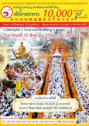 ปทุมธานี- ชวนพุทธศาสนิกชนทั่วไทยร่วมบุญ ตักบาตรพระนานาชาติ 10,000 รูป กลางเมืองหาดใหญ่ 10 ส.ค.นี้