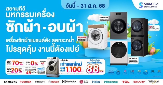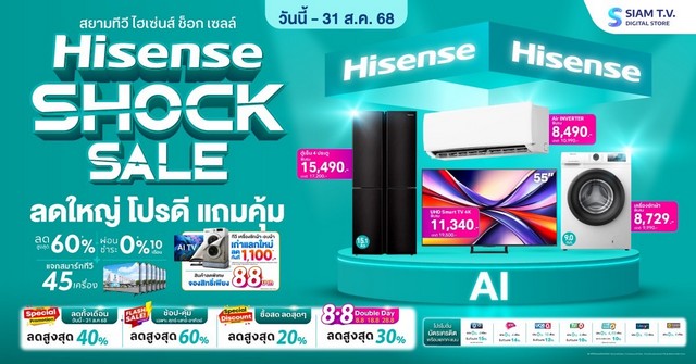 พบกับดีลสุดช็อกจากแบรนด์ Hisense ทั้งทีวี ตู้เย็น เครื่องซักผ้า และเครื่องฟอกอากาศ ลดสูงสุด 70%* จ่ายสดลดเพิ่ม และดีล Flash Sale สุดสัปดาห์ สยามทีวี ขอเชิญชวนลูกค้าทุกท่านไม่ว่าจะเป็นผู้ที่ต้องการเปลี่ยนเครื่องใช้ไฟฟ้าชิ้นใหม่ อัปเกรดเครื่องเก่า หรือมองหาอุปกรณ์ไอทีสำหรับเปิดเทอม ให้มาร่วมสัมผัสโปรโมชั่นสุดยิ่งใหญ่ที่ไม่เคยมีมาก่อนได้แล้ววันนี้ ตลอดเดือนสิงหาคม 2568 ที่สยามทีวีทุกสาขาใกล้บ้านท่าน