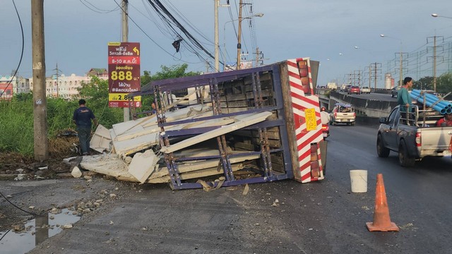 ปทุมธานี รถบรรทุกแผนปูนพลิกคว่ำ ถนน.ซ่อมสร้าง เกี่ยวสายไฟทำไฟดับ รถติดหนัก