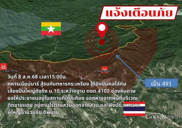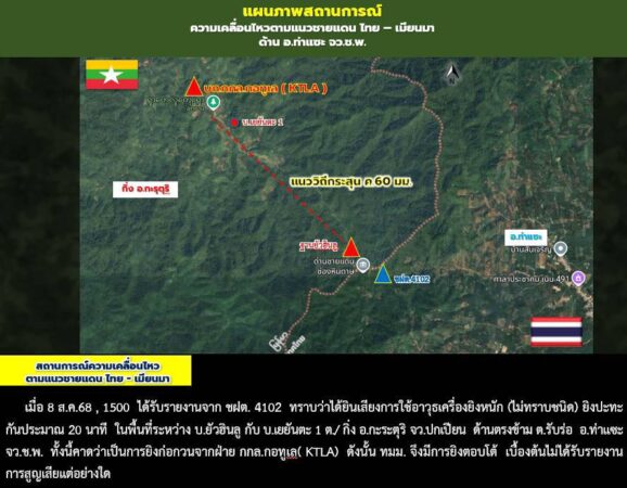 วันที่ 8 สิงหาคม 2568 เวลา 15.00 ได้รับรายงานจาก ชุดเฝ้าตรวจชายแดน ที่ 4102 ทราบว่าได้ยินเสียงการใช้อาวุธเครื่องยิงหนัก (ไม่ทราบชนิด) ยิงปะทะกันประมาณ ๒๐ นาที ในพื้นที่ระหว่าง บ.ยัวฮินลู กับ บ.เยยันตะ ๑ ต./ กิ่ง อ.กะระตุริ จว.ปกเปียน ด้านตรงข้าม ต.รับร่อ อ.ท่าแซะ จว.ช.พ. ทั้งนี้คาดว่าเป็นการยิงก่อกวนจากฝ่าย กกล.กอทูเล ( KTLA ) ดังนั้น ทมม.ฐานปฏิบัติการยัวฮินลู จึงยิงตอบโต้ ปัจจุบันสถานการณ์กลับสู่สภาวะปกติ และไม่ได้รับรายงานการสูญเสียอย่างใด
