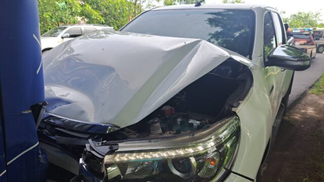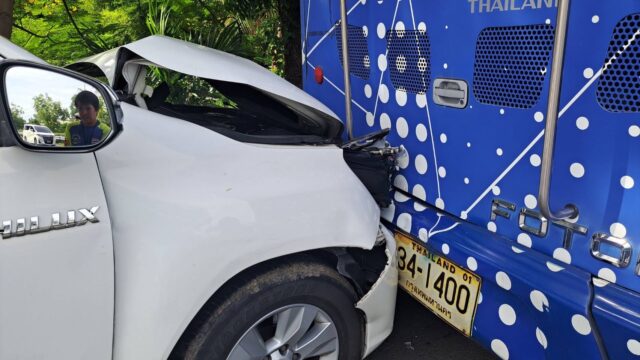 รถกระบะโตโยต้า สีขาว ทะเบียน 5กษ-4796 กทม. ด้านหน้าพังยับเยิน คนขับเป็นหญิง ยังไม่ทราบชื่อ ขณะนี้ได้รับบาดเจ็บ