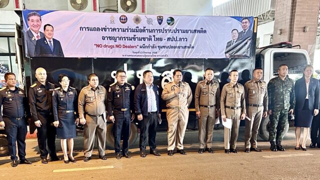 วันที่ 13 สิงหาคม 2568 ที่ห้องประชุมศุลกากรหนองคาย สะพานมิตรภาพไทย–ลาว อ.เมืองหนองคาย นายอภิกิต ฉ.โรจน์ประเสริฐ รองเลขาธิการ ป.ป.ส. พร้อมนายสมภพ สมิตะสิริ ผู้ว่าราชการจังหวัดหนองคาย และหน่วยงานความมั่นคง ร่วมแถลงผลความร่วมมือไทย–ลาวในการรับตัวผู้ต้องหาคดียาเสพติดหลบหนีหมายจับกลับไทย จำนวน 5 ราย ตามโครงการประสานความร่วมมือระหว่างประเทศเพื่อปราบปรามยาเสพติด