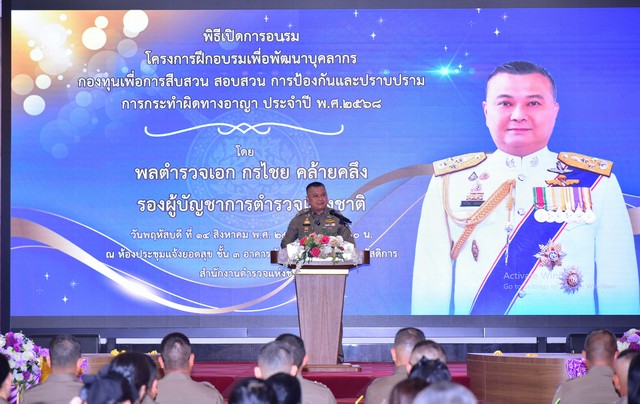 วันนี้ (14 สิงหาคม 2568) เวลา 10.00 น. พล.ต.อ.กรไชย คล้ายคลึง รองผู้บัญชาการตำรวจแห่งชาติ (รอง ผบ.ตร.) เป็นประธานพิธีเปิดโครงการฝึกอบรมเพื่อพัฒนาบุคลากร กองทุนเพื่อการสืบสวน สอบสวน การป้องกันและปราบปรามการกระทำผิดทางอาญา ประจำปี พ.ศ.2568 ณ ห้องแจ้งยอดสุข อาคารศูนย์ฝึกอบรมพัฒนาบุคลากรและสวัสดิการ สำนักงานตำรวจแห่งชาติ