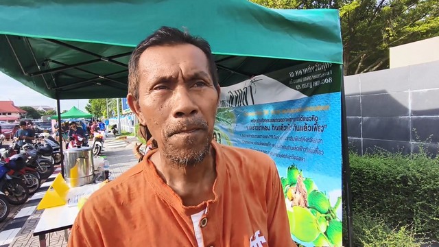 วันนี้ 16 สิงหาคม 2568 ที่บริเวณหน้าป้ายเทศบาลนครสงขลา ตรงข้ามสนามกีฬาติณสูลานนท์ ถนนราชดำเนิน อำเภอเมือง จังหวัดสงขลา นายธนพงศ์ เจ๊ะพงศ์ อายุ 60 ปี อดีตผู้ใหญ่บ้าน หมู่ที่ 2 ต.ชุมพล อ.สทิงพระ จ.สงขลา ที่เพิ่งปลดเกษียณเมื่อ 2 เดือนที่ผ่านมา ซึ่งปลูกมะพร้าวน้ำหอม ในพื้นที่ 12 ไร่ บริเวณขอบบ่อเลี้ยงกุ้งร้างริมทะเล ที่เลิกเลี้ยงกุ้งไปนานแล้วตั้งแต่ปี 2558 และในปี 2559 ก็เลยหันมาปลูกมะพร้าวน้ำหอมแทน เต็มพื้นที่ทั้งหมดประมาณ 500 ต้น ได้นำมะพร้าวน้ำหอมจากสวนในตำบลชุมพล จำนวน 400 ลูก และน้ำมะพร้าวน้ำหอมแช่เย็น จำนวน 100 ถุง มาวางขาย ได้รับความสนใจจากประชาชนเป็นอย่างมาก แวะเวียนมาซื้ออย่างไม่ขาดสาย เนื่องจากราคามะพร้าวน้ำหอม ลูกละเพียง 10 บาทเท่านั้น และน้ำมะพร้าวน้ำหอม เย็นๆ ถุงละ 15 บาท กินแล้วชื่นใจ น้ำมะพร้าว 100 ถุงใช้เวลาไม่นานก็หมด