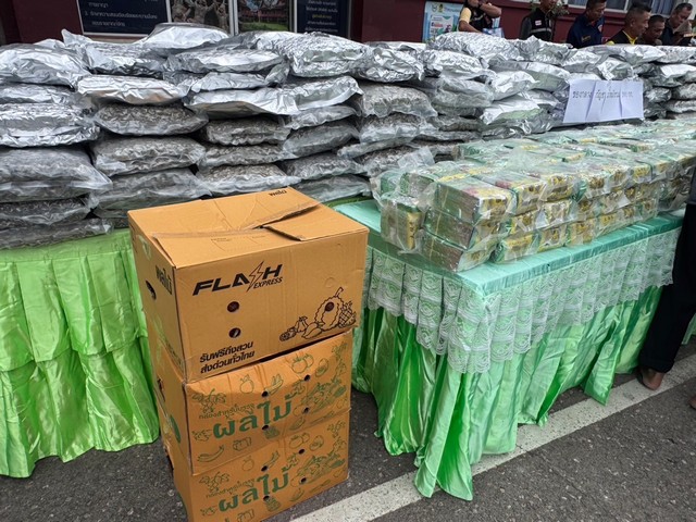 ,น.ส.พนิดา(นามสมมุติ)อายุ 22 ปี ตรวจยึด ของกลางยาเสพติดดังนี้ (1)ยาไอซ์ 210 กิโลกรัม (2.)กัญชาอัดแท่ง 390 กิโลกรัม รวมมูลค่ากว่า 81 ล้านบาท