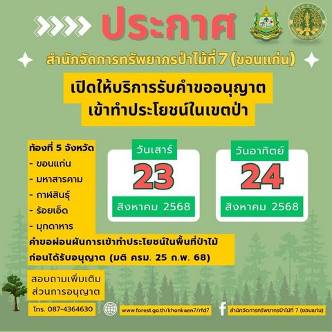 นายวิทยา กล่าวอีกว่า ในช่วง 3 วันสุดท้ายนี้ หน่วยงานราชการในท้องที่ จ.ขอนแก่น มหาสารคาม กาฬสินธุ์ ร้อยเอ็ด และมุกดาหารสามารถเข้ายื่นคำขอผ่อนผันที่สำนักจัดการทรัพยากรป่าไม้ที่ 7 (ขอนแก่น) ซึ่งได้เปิดให้บริการพิเศษรับคำขออนุญาตเข้าทำประโยชน์ในเขตป่าช่วงวันหยุด วันเสาร์ที่ 23 และวันอาทิตย์ที่ 24 สิงหาคม 2568 ด้วย