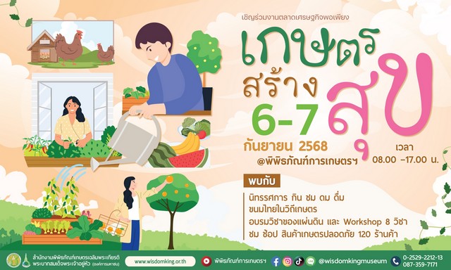 เมื่อวันที่ 26 สิงหาคม 2568 ผู้สื่อข่าวรายงานว่า พิพิธภัณฑ์การเกษตรเฉลิมพระเกียรติพระบาทสมเด็จพระเจ้าอยู่หัว จังหวัดปทุมธานี เตรียมจัดงานตลาดเศรษฐกิจพอเพียง “เกษตรสร้างสุข” ระหว่างวันที่ 6 – 7 กันยายน 2568 เวลา 08.00 – 17.00 น. เพื่อส่งเสริมแนวทางการเกษตรอย่างมีความสุขและยั่งยืนตามหลักเศรษฐกิจพอเพียง