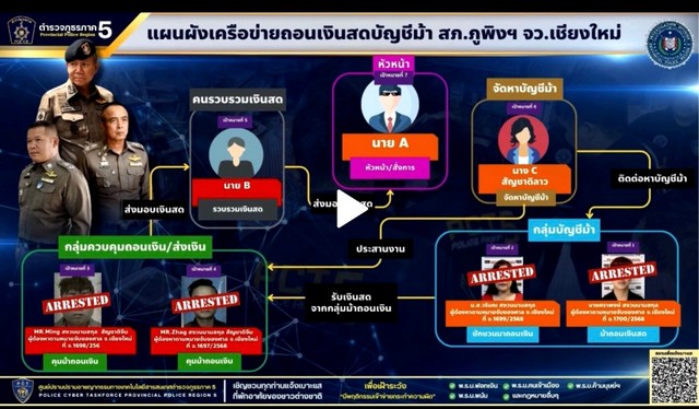 คดี ศปอส.ภ.5 ร่วมกับ บก.สส.ภ.5 จับกุม 2 คนจีน ร่วมบัญชีม้าคนไทย ขบวนการถอนเงินเชื่อมโยงแก๊งคอลเซ็นเตอร์ ตรวจยึดเงินสด 1,539,000 บาท ถอนทันทีหลังผู้เสียหายโอนไปเพียง 25 นาที
