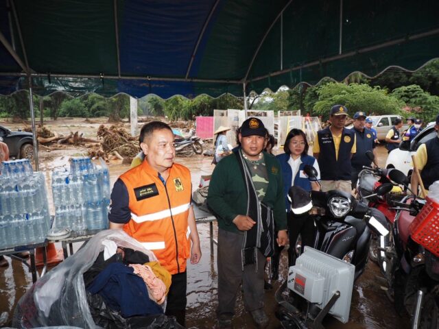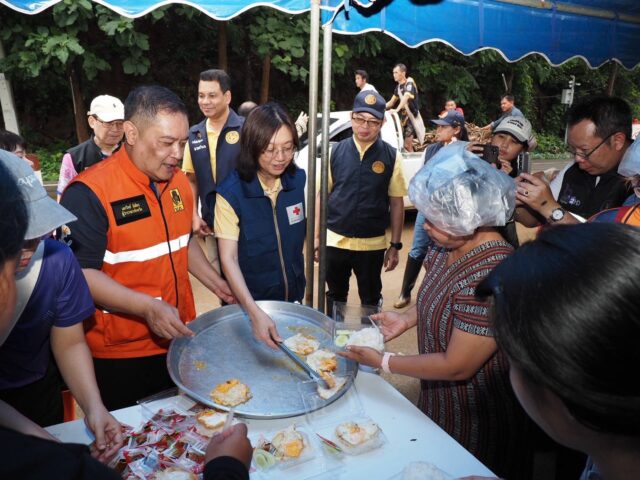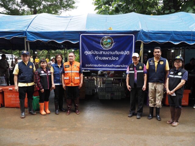 จากนั้น ผู้ว่าราชการจังหวัดแม่ฮ่องสอน พร้อมด้วยนายกเหล่ากาชาดจังหวัดแม่ฮ่องสอน ได้เยี่ยมให้กำลังใจ บ้านผู้ที่ได้รับผลกระทบจากอุทกภัย น้ำป่าไหลหลาก และเยี่ยมศูนย์ประสานงานภัยพิบัติตำบลผาบ่อง เพื่อให้กำลังใจประชาชนจิตอาสาที่ได้ร่วมกันประกอบอาหารเลี้ยงผู้ประสบภัยพิบัติ เป็นการบรรเทาความเดือดร้อนในเบื้องต้น พร้อมนี้ผู้ว่าราชการจังหวัดแม่ฮ่องสอน และนายกเหล่ากาชาดจังหวัดแม่ฮ่องสอน ได้ร่วมตักบรรจุอาหาร เพื่อมอบให้กับผู้ประสบภัยพิบัติด้วย