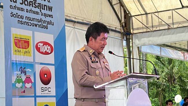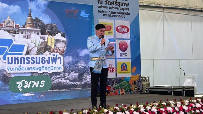 วันที่ 1 กันยายน 2568 เวลา 11.00 น. ณ วัดศรีสุเทพ ต.ท่าแซะ อ.ท่าแซะ จ.ชุมพร นายเธียรชัย ชูกิตติวิบูลย์ เป็นประธานพิธีเปิดงาน ซึ่งกรมการค้าภายใน กระทรวงพาณิชย์ ได้ดำเนินการจัดงานเพื่อเดินหน้าขับเคลื่อน