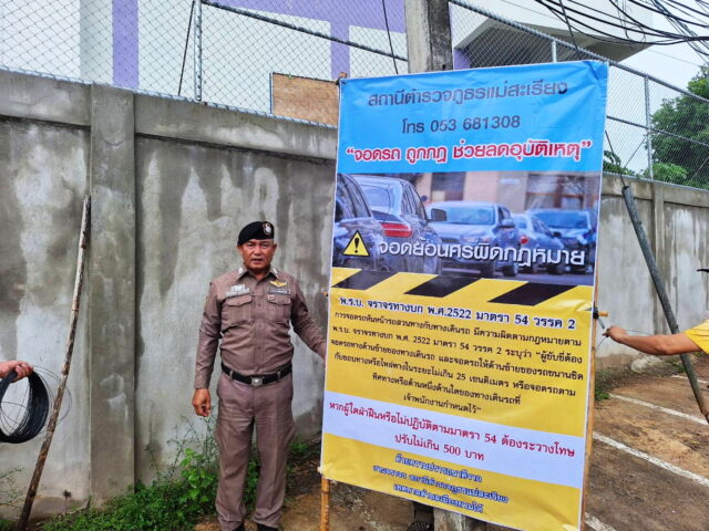 โดยการอำนวยการของ พ.ต.อ.รัฐวิชญ์ วศินพงศ์ธนัช ผกก.สภ.แม่สะเรียง มอบหมายให้ พ.ต.ท.จักษ์พัฒน์ดอกจันทร์ รองผกก.ป.สภ.แม่สะเรียง ข่าย60พร้อม201 รับมอบป้ายจากเทศบาลตำบลเมืองยวมใต้ โดยมีนายพงศ์นิรัตน์ กาหลง ผู้อำนวยการกองช่างรักษาราชการแทนปลัดเทศบาลตำบลเมืองยวมใต้ และ นายถนอม ลำซาง นักป้องกันและบรรเทาสาธารณภัยฯ รวมไปถึง พนักงานงานป้องกันและบรรเทาสาธารณภัย ร่วมมอบป้ายการจัดระเบียบการจราจร ให้กับงานจราจรสถานีตำรวจภูธรแม่สะเรียง เพื่อแก้ไขปัญหาอุบัติเหตุทางถนนในเขตเทศบาลตำบลเมืองยวมใต้ และ สร้างความปลอดภัยของชีวิตและทรัพย์สินให้แก่ประชาชน โดยมุ่งเน้นให้ผู้ขับขี่ปฏิบัติตามกฎจราจรได้อย่างถูกต้อง โดยดำเนินติดตั้งป้ายบริเวณถนนเวียงใหม่ จำนวน 12 ป้าย ซึ่งเป็น ป้ายประชาสัมพันธ์ จอดรถย้อนศรผิดกฏหมาย ตาม พ.ร.บ.จราจรทางบก พ.ศ.2522 มาตรา 54 วรรค 2 การจอดรถหันหน้ารถสวนทางกับทางเดินรถ เป็นต้น