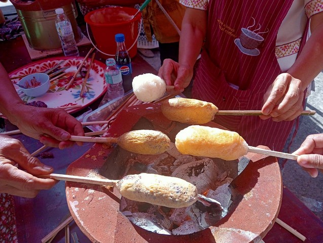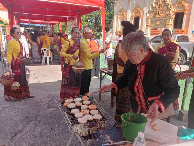 สำหรับข้าวจี่ ถือเป็นอาหารพื้นบ้านชาวอีสาน เดิมใช้ข้าวเหนียวที่นึ่งสุก ปั้นเป็นก้อนกลมโรยด้วยเกลือแกง ใช้ไม้เสียบตรงกลางแล้วนำไปอิงถ่านไฟร้อน ผิวข้าวจี่ก็จะเกรียมมีสีเหลือง กลิ่นหอม ต่อมามีการประยุกต์เป็นข้าวจี่มูน ปั้นเป็นก้อนหรือทำเป็นแผ่น นำชุบไข่เป็ดหรือไข่ไก่ที่ใช้เครื่องตีเป็นเนื้อเดียวกัน จากนั้นนำไปอิงถ่านไฟ ก็จะให้กลิ่นหอมกรุ่นน่ารับประทาน สามารถรับประทานเป็นอาหาร และทำจำหน่าย นิยมรับประทานในฤดูหนาว และมีการจัดงานบุญข้าวจี่ตามวิถีอีสานในช่วงบุญเดือน 3 หรือบุญข้าวจี่ ซึ่งตรงกับวันมาฆบูชา ในโครงการถนนสายบุญนวพุทธศิลป์ ถิ่นเมืองน้ำดำครั้งนี้ จึงได้จัดกิจกรรมปาร์ตี้ข้าวจี่ เพื่อร่วมกันอนุรักษ์และให้อนุชนรุ่นหลังได้ร่วมสืบสานและต่อยอดด้วย
