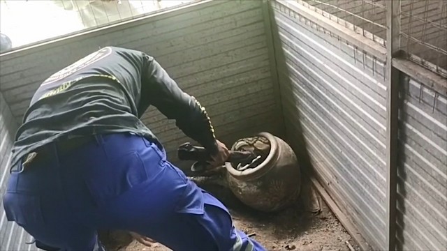 เมื่อไปถึงนายทวีศักดิ์ ฯ จึงรีบเดินไปตรวจสอบในเล้าไก่ชน ก็พบว่างูเหลือมตัวใหญ่ หลังจากเขมือบไก่ชน และ นกพิราบ จนอิ่มแล้วจึงเลื้อยมาซุกในโอ่งใบเล็กภายในเล้าไก่ชน จึงเข้าทำการใช้อุปกรณ์ในการจับงูเข้าจับงูเหลือม แต่งูเหลือมแสดงความดุร้าย ฉกใส่หลายครั้ง เจ้าหน้าที่ต้องใช้ความระมัดระวังในการจับงูเหลือมอยู่นานประมาณ 2 นาที ก็สามารถจับงูเหลือมออกมาจากโอ่งใบเล็กได้ นำมาวางไว้ที่สนามหญ้า สักพักงูเหลือมก็ได้ขย่อนไก่ชน และนกพิราบ อย่างละ 1 ตัว ออกมาเสร็จจึงรีบจับนำใส่กระสอบเตรียมไปปล่อยคืนสู่ป่าธรรมชาติที่อยู่ห่างไกลบ้านเรือนผู้คนต่อไป