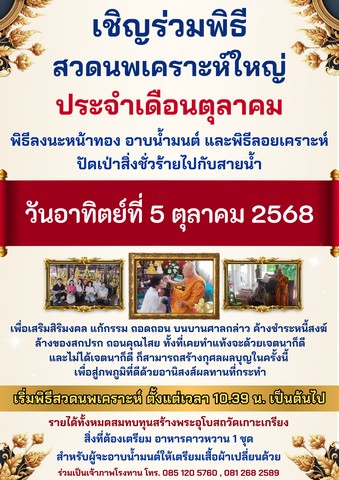 ขอเชิญร่วมพิธีสวดนพเคราะห์ใหญ่ เพื่อเสริมสิริมงคล ณ วัดเกาะเกรียง ต.บางคูวัด อ.เมืองจ.ปทุมธานี ในวันอาทิตย์ที่ 5 ต.ค.68 นี้!