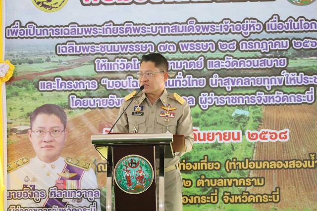 วันที่ 19 กันยายน 2568 นายอังกูร ศีลาเทวากูล ผู้ว่าราชการจังหวัดกระบี่ เป็นประธานในพิธีมอบโฉนดที่ดิน เพื่อเฉลิมพระเกียรติพระบาทสมเด็จพระเจ้าอยู่หัว เนื่องในโอกาสมหามงคลเฉลิมพระชนมพรรษา 73 พรรษา และขับเคลื่อนโครงการ “มอบที่ดินทั่วไทย นำสุขคลายทุกข์ประชาชน” โดยมี นายชูชีพ ประกอบชาติ เจ้าพนักงานที่ดินจังหวัดกระบี่ นายกิตติ กิตติธรกุล นายถิรเดช ตั้งมั่นก่อกิจ สมาชิกสภาผู้แทนราษฎร จังหวัดกระบี่ นายกองค์การบริหารส่วนตำบลเขาคราม นายกเทศมนตรีตำบลคลองหิน หัวหน้าส่วนราชการ ผู้นำท้องถิ่น ข้าราชการ ผู้อำนวยการศูนย์เดินสำรวจออกโฉนดที่ดินจังหวัดสุราษฎร์ธานี-กระบี่-ระนอง-พังงา-ชุมพร และประชาชนผู้รับมอบโฉนดที่ดิน เข้าร่วม ณ ศูนย์บริการนักท่องเที่ยว (ท่าปอมครองสองน้ำ) หมู่ที่ 2 ตำบลเขาคราม อำเมืองกระบี่ จังหวัดกระบี่