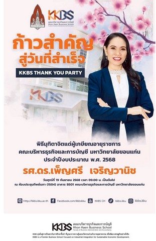 เมื่อวันที่ 19 กันยายน 2568 คณะบริหารธุรกิจและการบัญชีมหาวิทยาลัยขอนแก่น จัดพิธีมุทิตาจิตแต่ผู้เกษียณอายุราชการ ประจำปีงบประมาณ 2568 ภายใต้ชื่องาน “ก้าวสำคัญ สู่วันที่สำเร็จ” ณ ห้องประชุมทิพย์นภา(1504) อาคาร B501 เพื่อเชิดชูเกียรติผู้มีคุญปการต่อคณะฯ ผู้ทุ่มเทแรงกายแรงใจให้แก่วงการศึกษา การวิจัย และการบริการวิชาการตลอดหลายทศวรรษที่ผ่านมา โดยปีนี้เป็นวาระการเกษียณของ รองศาสตราจารย์ ดร.เพ็ญศรี เจริญวานิช รองอธิการบดีฝ่ายกิจการนักศึกษาและนวัตวณิชย์ มหาวิทยาลัยขอนแก่น คณบดีคณะบริหารธุรธุรกิจและการบัญชี วาระ พ.ศ. 2559 – พ.ศ. 2567