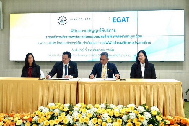 เมื่อวันที่ 22 กันยายน 2568 นายเมธาวัจน์ พงศ์รดาภิรมย์ รองผู้ว่าการธุรกิจเกี่ยวเนื่อง (รวธ.) การไฟฟ้าฝ่ายผลิตแห่งประเทศไทย (กฟผ.) ร่วมเป็นเกียรติในงานลงนามสัญญา (MOU) ให้บริการบริหารจัดการพลังงานโดยระบบผลิตไฟฟ้าพลังงานหมุนเวียน ระหว่าง กฟผ.และ บริษัท ไอดับบลิวอาร์เอ็ม จำกัด (IWRM) ผู้ให้บริการน้ำเพื่ออุตสาหกรรมรายใหญ่ในพื้นที่ ระเบียงเศรษฐกิจภาคตะวันออก (EEC) โดยมีนายสายัณห์ ปานซัง ผู้ช่วยผู้ว่าการบริหารธุรกิจ (ชธก.) และนายธนวัฒน์ สันตินรนนท์ กรรมการผู้จัดการ IWRM ร่วมลงนามในสัญญา พร้อมด้วยนางณิศรา ธัมมะปาละ ผู้อำนวยการฝ่ายจัดการธุรกิจนวัตกรรมพลังงาน (อธพ.) และนางอัมพวัน พงศ์สิทธิศักดิ์ ประธานเจ้าหน้าที่ฝ่ายปฏิบัติการ IWRM ลงนามในฐานะพยาน ณ ห้อง Press Conference สำนักงานใหญ่ กฟผ. จ.นนทบุรี