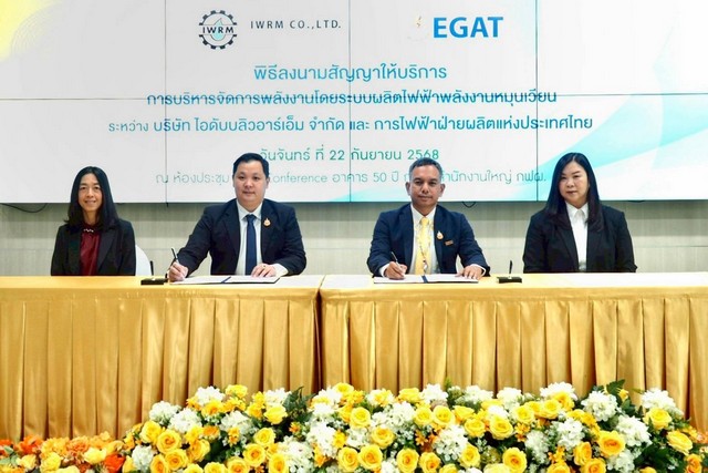 เมื่อวันที่ 22 กันยายน 2568 นายเมธาวัจน์ พงศ์รดาภิรมย์ รองผู้ว่าการธุรกิจเกี่ยวเนื่อง (รวธ.) การไฟฟ้าฝ่ายผลิตแห่งประเทศไทย (กฟผ.) ร่วมเป็นเกียรติในงานลงนามสัญญา (MOU) ให้บริการบริหารจัดการพลังงานโดยระบบผลิตไฟฟ้าพลังงานหมุนเวียน ระหว่าง กฟผ.และ บริษัท ไอดับบลิวอาร์เอ็ม จำกัด (IWRM) ผู้ให้บริการน้ำเพื่ออุตสาหกรรมรายใหญ่ในพื้นที่ ระเบียงเศรษฐกิจภาคตะวันออก (EEC) โดยมีนายสายัณห์ ปานซัง ผู้ช่วยผู้ว่าการบริหารธุรกิจ (ชธก.) และนายธนวัฒน์ สันตินรนนท์ กรรมการผู้จัดการ IWRM ร่วมลงนามในสัญญา พร้อมด้วยนางณิศรา ธัมมะปาละ ผู้อำนวยการฝ่ายจัดการธุรกิจนวัตกรรมพลังงาน (อธพ.) และนางอัมพวัน พงศ์สิทธิศักดิ์ ประธานเจ้าหน้าที่ฝ่ายปฏิบัติการ IWRM ลงนามในฐานะพยาน ณ ห้อง Press Conference สำนักงานใหญ่ กฟผ. จ.นนทบุรี