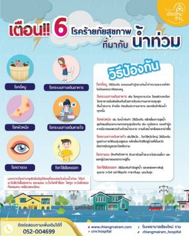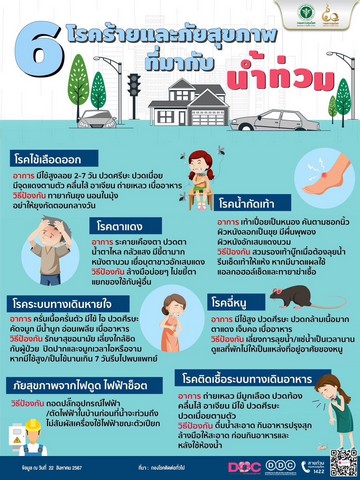สำหรับ โรคและภัยสุขภาพที่ต้องระมัดระวังในช่วงน้ำท่วม มีดังนี้ 1) กลุ่มโรคระบบทางเดินหายใจ คือ โรคไข้หวัดใหญ่ อาการ : ไอ คัดจมูก น้ำมูก เจ็บคอ ไข้สูงนานเกิน 7 วัน ป้องกัน : รักษาสุขอนามัย เว้นระยะห่าง ปิดปากเวลาไอ/จาม และโรคปอดบวม 2) กลุ่มโรคติดต่อทางอาหารและน้ำ คือ โรคอาหารเป็นพิษและโรคอุจจาระร่วง อาการ : ถ่ายเหลว ปวดท้อง คลื่นไส้ อาเจียน ไข้ ป้องกัน : ดื่มน้ำสะอาด กินอาหารปรุงสุก ล้างมือก่อนกิน/หลังเข้าห้องน้ำ 3) กลุ่มโรคที่มักเกิดตามมากับน้ำท่วม คือ โรคไข้ฉี่หนู อาการ : ไข้สูง ปวดศีรษะ กล้ามเนื้อ ตาแดง เบื่ออาหาร ป้องกัน : เลี่ยงลุยน้ำ ควบคุมแหล่งที่อยู่อาศัยของหนู