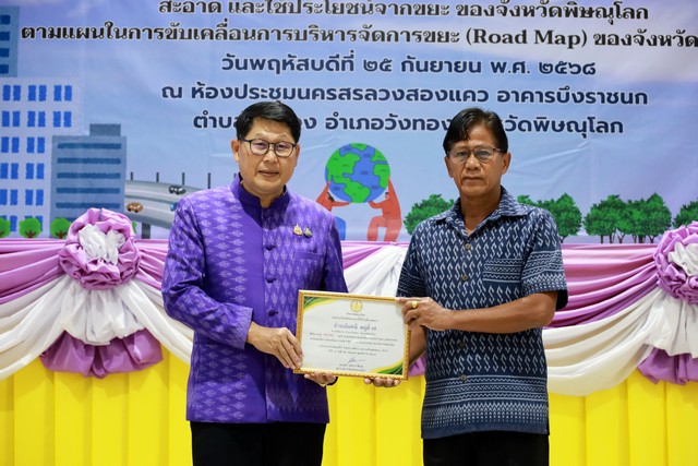 พิษณุโลก อบจ.พิษณุโลก ร่วมมอบเกียรติบัตรการประกวดหน่วยงานจัดการขยะต้นทาง สะอาด และใช้ประโยชน์จากขยะ ตามแผนในการขับเคลื่อปการบริหารจัดการขยะ (Road Map) ประจำปี 2568