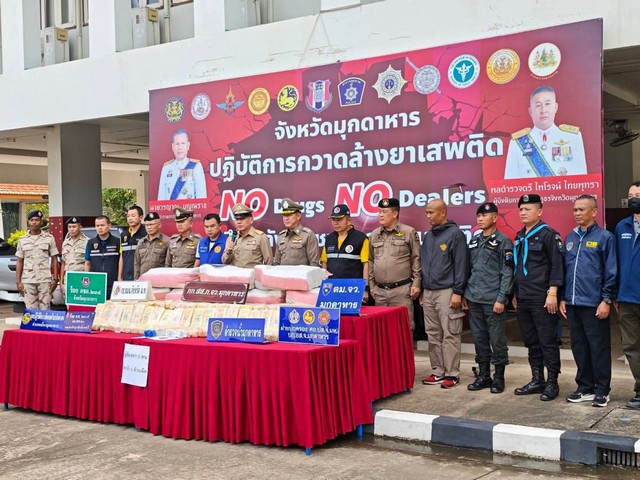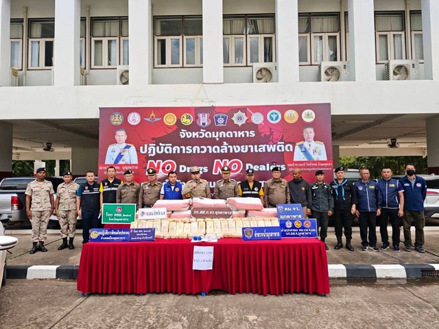 เมื่อวันที่ 25 กันยายน ที่กองบังคับการตำรวจภูธรจังหวัดมุกดาหาร นายวรญาณ บุญณราช ผู้ว่าราชการจังหวัดมุกดาหาร และพล.ต.ต.ไพโรจน์ ไทยพุทรา ผบก.ภ.จว.มุกดาหาร รวมแถลงข่าว ชุดสืบ ภ.จว.มุกดาหาร ตรวจยึดยาเสพติด 2 ล้านเม็ด พร้อมจับผมผู้ต้องหาได้ 3 ราย