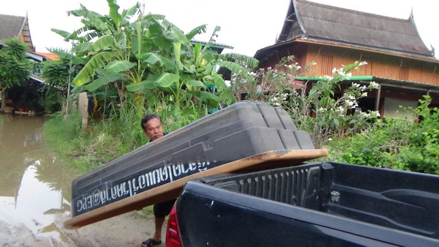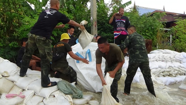 อ่างทอง-ชาวบ้านโพงเพงหวั่นเร่งขนของหาเรือ หลังกระสอบทรายกั้นน้ำพังรอบ 4 นายอำเภอพร้อมทหารประชาชนอุดจนอยู่