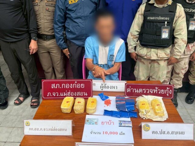 ได้รับการเปิดเผยข้อมูลจากชุดเจ้าหน้าที่จับกุม ว่า เมื่อ อาทิตย์ ที่ 5 ตุลาคม พ.ศ. 2568 เวลาประมาณ 02.30 น. ณ ด่านตรวจห้วยกุ้ง ต.ป่าโปง อ.สบเมย จ.แม่ฮ่องสอน ภายใต้การอำนวยการของ พล.ต.ต.ทรงกริช ออนตะไคร้ ผบก.ก.จว.แม่ฮ่องสอน , นายคำผัน โมกไรสง นายอำเภอสบเมย , นายธนวัฒน์ คงศิริ ปลัดอำเภอ ,นายชิติพัทธ์ ชูวงศ์ ปลัดอำเภอ , พ.ต.ต.อภิวัฒน์ ชินภูมิ รอง ผบก.ภ.จว.แม่ฮ่องสอน , พ.ต.ต.ณกรณ์ ศรี กันทา สวญ,สภ.กองก๋อย , พ.ต.ท.ภาคภูมิ เครีย สว.กก.สส.ภ.จว.แม่ฮ่องสอน , พ.ต.ต.ต.ประสงค์การณ์ สว. สส.สภ.กองก๋อย พร้อม เจ้าหน้าที่ชุดจับกุมร่วมกับ ฝ่ายปกครอง อ.สบเมย ประกอบด้วย ได้ร่วมกันทำการจับกุมตัว นายประเวช นามสมมุติ)อายุ 55 ปี อาศัยอยู่บ้านแม่สุ อ.แม่ลาน้อย จ.แม่ฮ่องสอน พร้อมด้วยของกลาง ยาเสพติดให้โทษประเภทที่ 1 (ยาบ้า) เม็ดสีส้มและเม็ดสีเขียวปะปนกัน ลักษณะเม็ดกลมแบน ด้านหนึ่งเรียบ อีก ด้านประทับตราอักษรภาษาอังกฤษ WY บรรจุอยู่ของพลาสติกของพลาสติกแบบซิปล็อค สีน้ำเงินและสีดำ ห่อหุ้มด้วย กระดาษสีขาวและพันด้วยเทบใส ภายนอกหุ้มด้วยกระดาษไข จำนวน 5 มัด มัดละ 10 ถุง ถุงละประมาณ 200 เม็ด รวมเป็นยาบ้าทั้งหมดประมาณ 10,000 เม็ด โทรศัพท์มือถือ ยี่ห้อOPPO รุ่น AIk สีแดง จำนวน 1 เครื่อง ใส่ 2 ชิมการ์ด รถยนต์ ยี่ห้อนิสสัน รุ่นนาวาร่า สีขาว ทะเบียน บง 5799 แม่ฮ่องสอน จำนวน 1 คัน โดยเจ้าหน้าที่ตรวจพบของกลาง 2 จุด คือ ถุงกระสอบครึ่งใบสีขาว ใช้เทปกาวใสพันรอบ ห่อหุ้มด้วยกระดาษสีขาว ซุกช่อนอยู่ในรถยนต์บริเวณหลังเบาะผู้โดยสาร ที่ผู้ต้องหาขับขี่อยู่ และ พบอยู่ในกระเป้าคาดอก ลายพรางสีดำ ที่ผู้ต้องหาสะพายอยู่ โดยแจ้งข้อกล่าวหาให้ผู้ต้องหารับทราบว่ากระทำผิดฐาน “มีไว้ในครอบครองซึ่งยาเสพติดให้โทษประเภท 1 (เมทแอม เฟตามีนหรือยาบ้า) โดยไม่ได้รับอนุญาต และเป็นการกระทำก่อให้เกิดการแพร่กระจายในกลุ่มประชาชน อันเป็นการ ทำให้เกิดผลกระทบต่อความมั่นคงของรัฐ หรือความปลอดภัยของประชาชนทั่วไป,