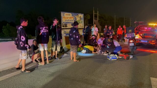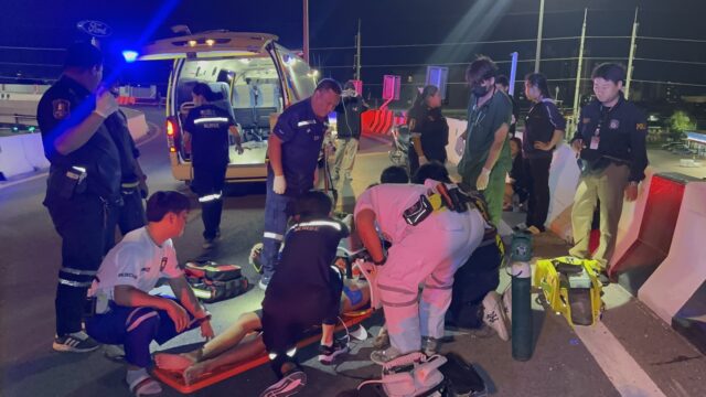 ที่เกิดเหตุพบรถจักรยานยนต์ ยามาฮ่า จีราโน่ สีดำ ทะเบียน 5 กจ 3587 ชลบุรี เสียหลักล้มคว่ำไถลไปชนกับแบริเออร์ราวสะพาน ขาขึ้นทางด่วนจนได้รับความเสียหาย มีนายธาวิน(นามสมมุติ)อายุ 18 ปี นักเรียนชั้นมัธยมศึกษา ปีที่ 6 ได้รับบาดเจ็บอาการสาหัส แขนขวาหักหายใจรวยริน เจ้าหน้าที่กู้ภัยฯ ให้การช่วยเหลือปฐมพยาบาลเบื้องต้นปั้มหัวใจเพื่อยื้อชีวิต ก่อนเคลื่อนย้ายส่งโรงพยาบาลอย่างเร่งด่วน