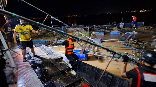 มุกดาหาร -พายุซัดกระชังปลาน้ำโขงขาด! ลอยชนแพเรือตำรวจน้ำมุกดาหาร เจ้าหน้าที่เร่งรื้อถอนฝ่ากระแสน้ำเชี่ยว