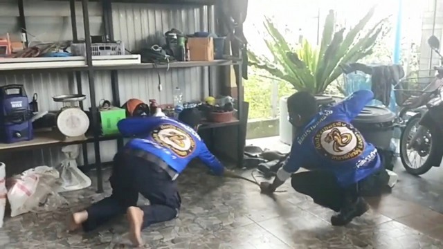 หลังรับแจ้ง นายทวีศักดิ์ ฯ จึงพร้อมด้วยนาย อภิชาติ พรหมสงค์ และกู้ชีพ อบต.สะท้อน กู้ชีพ อบต.ท่าประดู่ รีบนำอุปกรณ์ในการจับงูเข้าทำการตรวจสอบทันที