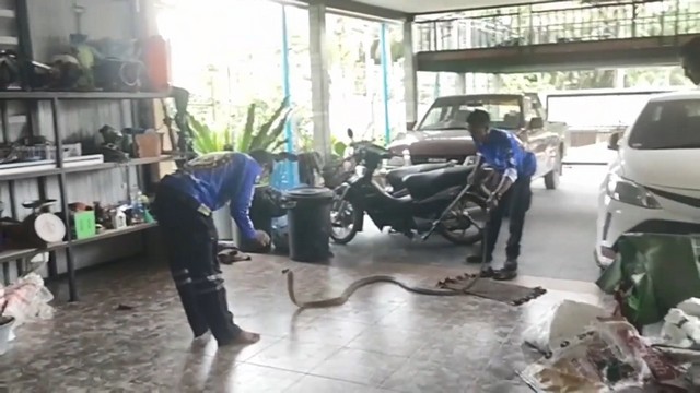 เมื่อเจ้าหน้าที่ไปถึงบ้านที่ได้รับแจ้ง ก็รีบเข้าตรวจสอบที่ใต้ชั้นวางของทันที ก็พบงูตัวใหญ่ นอนขดตัวอยู่ จึงทราบว่าเป็นงูจงอาง เจ้าหน้าที่จึงใช้อุปกรณ์ในการจับงูเข้าทำการจับงูจงอางทันทีโดยใช้เวลาไม่นานนักก็สามารถจับหัวงูจงอางไว้ได้ จึงรีบนำใส่กระสอบเตรียมนำไปปล่อยคืนสู่ป่าธรรมชาติที่อยู่ห่างไกลบ้านเรือนผู้คนต่อไป