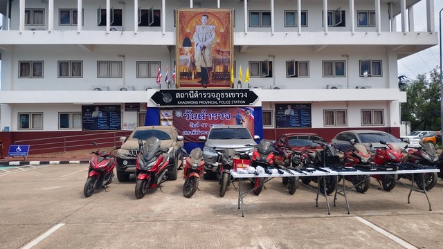 นำโดย พ.ต.ท.พิพัฒน์ พานเพ็ชร์ สว.กก.สืบสวน 3 ร่วมกับ พ.ต.อ.สมชาย ภูกองชนะ ผกก.สภ.เขาวง พร้อมเจ้าหน้าที่ตำรวจสภ.เขาวง และเจ้าหน้าที่ชุดจับกุมแถลงผลการจับกุมตัวตัวนายชลสิทธิ์ (นามสมมุติ)อายุ 27 ปี ที่อยู่ 266 หมู่ 9 ต.สมเด็จ อ.สมเด็จ จ.กาฬสินธุ์ ผู้ต้องหาตามหมายจับของ ศาลจังหวัดกาฬสินธุ์ ที่ 387/2568 ลงวันที่ 28 สิงหาคม 2568 พร้อมของกลางเป็นรถยนต์ 4 คัน รถจักรยานยนต์ 12 คัน.มูลค่ารวมประมาณ 6 ล้านบาท