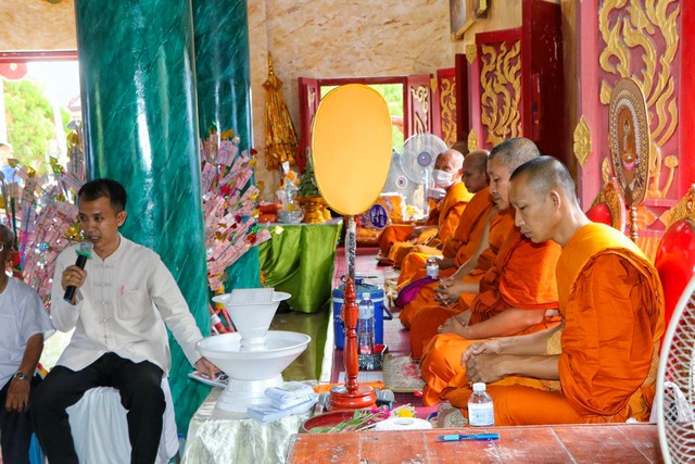 ภายในอุโบสถ ประธานในพิธีได้ จุดธูปเทียนบูชาพระรัตนตรัย จากนั้นพระสงฆ์ได้ประกอบ พิธีเจริญพระพุทธมนต์ เพื่อความเป็นสิริมงคลแก่ผู้ร่วมงานและครอบครัว