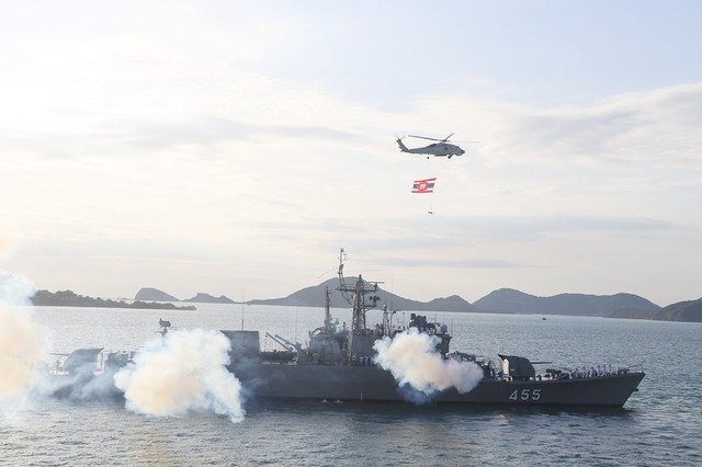 ร.ล.เจ้าพระยา ยิงสลุต19 นัด คำนับผู้บัญชาการทหารเรือ ในโอกาสตรวจเยี่ยมกองเรือยุทธการ บนเรือหลวงจักรีนฤเบศร