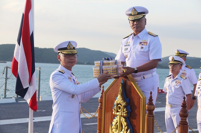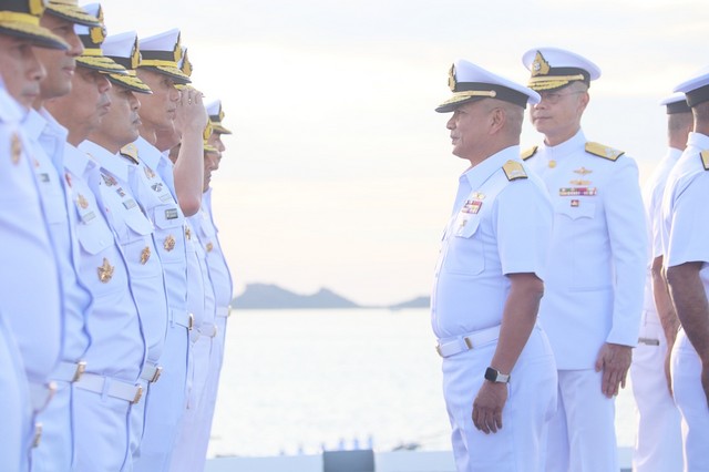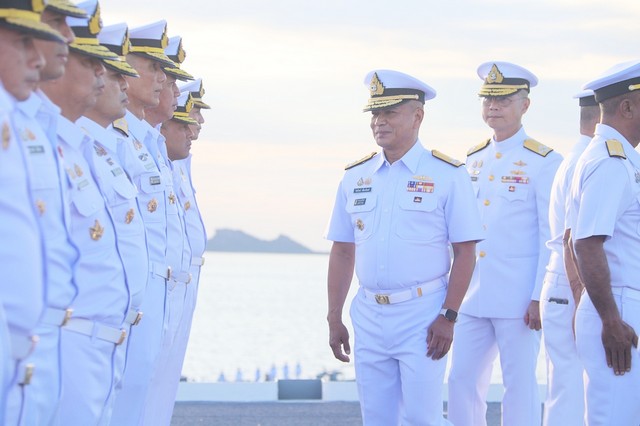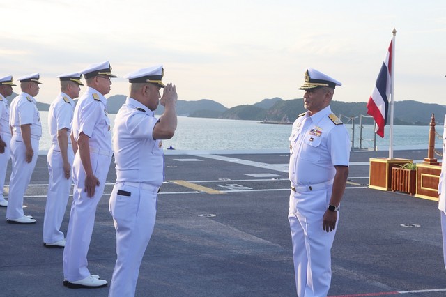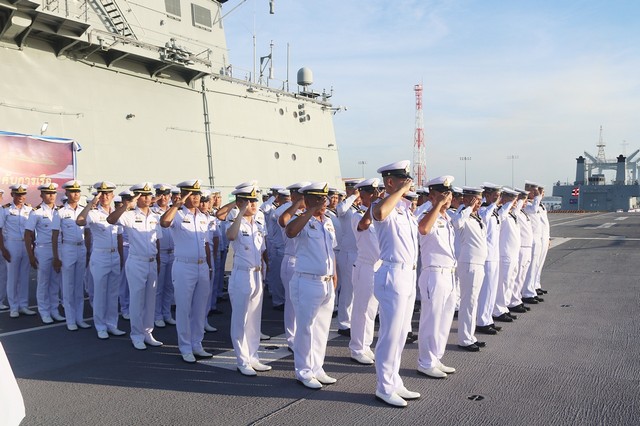 วันนี้ ( 24 ตุลาคม 2568) พลเรือเอก ไพโรจน์ เฟื่องจันทร์ ผู้บัญชาการทหารเรือ พร้อมด้วยคณะนายทหารชั้นผู้ใหญ่ของกองทัพเรือ เดินทางไปตรวจเยี่ยมกองเรือยุทธการ บนเรือหลวงจักรีนฤเบศร โดยมี พลเรือเอก กรวิทย์ ฉายะรถี ผู้บัญชาการกองเรือยุทธการ และนายทหารชั้นผู้ใหญ่จากหน่วยต่าง ๆ ของกองทัพเรือในสังกัดของกองเรือยุทธการ ให้การต้อนรับ พร้อมทั้งเรียนเชิญผู้บัญชาการทหารเรือ ขึ้นแท่นเพื่อรับการยิงสลุตคำนับ โดยเรือหลวงเจ้าพระยา จำนวน 19 นัด ณ ท่าเรือจุกเสม็ด การท่าเรือสัตหีบ ฐานทัพเรือสัตหีบ อำเภอสัตหีบ จังหวัดชลบุรี