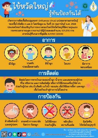 จากข้อมูลของกรมควบคุมโรค กระทรวงสาธารณสุข เตือน โรคไข้หวัดใหญ่ เป็นโรคที่พบมากในช่วงอากาศชื้นและเย็น ช่วงนี้ประเทศไทยมีฝนตกในหลายพื้นที่ ทำให้พบผู้ป่วยเพิ่มขึ้นอย่างต่อเนื่อง กลุ่มอายุที่พบสูงสุดคือ กลุ่มอายุ 5 – 9 ปี รองลงมา 0 – 4 ปี สำหรับโรคไข้หวัดใหญ่สามารถติดต่อได้ง่ายจากการสัมผัสสารคัดหลั่ง (น้ำมูก น้ำลาย หรือเสมหะ) ของผู้ป่วยผ่านการไอหรือจาม อาการของโรคจะคล้ายไข้หวัด แต่จะมีอาการปวดกล้ามเนื้อมาก ปวดศีรษะ ไอ เจ็บคอ มีน้ำมูก และอ่อนเพลีย จึงขอให้ประชาชนระมัดระวังป้องกันโรคไข้หวัดใหญ่อย่างต่อเนื่อง