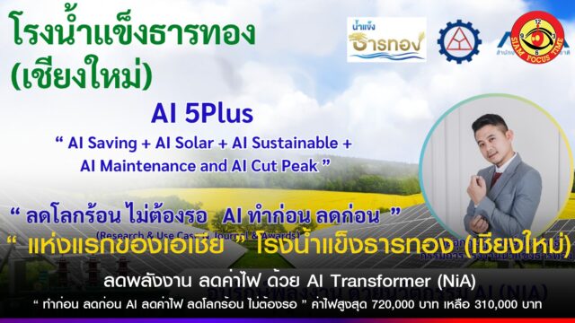 “ แห่งแรกของเอเชีย ” โรงน้ำแข็งธารทอง (เชียงใหม่) ลดพลังงาน ลดค่าไฟ ด้วย AI Transformer (NiA)“ ทำก่อน ลดก่อน AI ลดค่าไฟ ลดโลกร้อน ไม่ต้องรอ ” ค่าไฟสูงสุด 720,000 บาท เหลือ 310,000 บาท