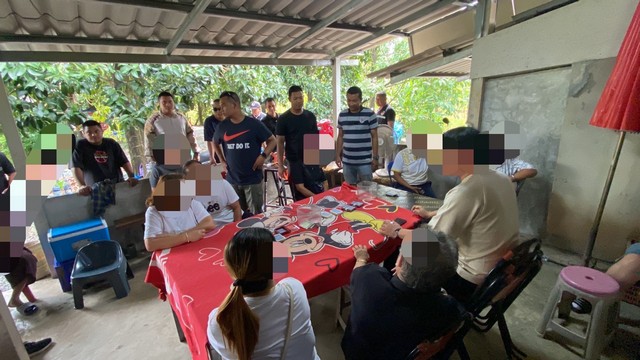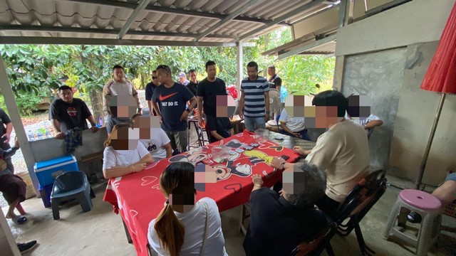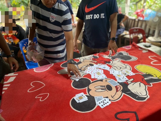 ทั้งหมดร่วมกันลักลอบเล่นการพนันไพ่รัมมี่และป๊อกเด้ง ที่บริเวรบ้านหลังหนึ่ง ที่เปิดเป็นบ่อนการพนันภายในสวนผลไม้ ซึ่งเป็นทำเล ที่บังสายตาและการได้ยินเสียง เสียงในการเล่นการพนันนั้น อออกไปภายนอกนั้นไม่ค่อยได้ยิน เพราะเนื่องจากสิ่งแวดล้อมบริเวณนั้นเป็นป่าเป็นสวนผลไม้หลายชนิดจึง เป็นการกรองเสียงเป็นอย่างดี ซึ่งทางเจ้าหน้าที่ได้หาข่าวและ สืบทราบข่าวว่าเป็นการเปิดบ่อนเล่นการพนันกันประจำเกือบจะทุกวัน