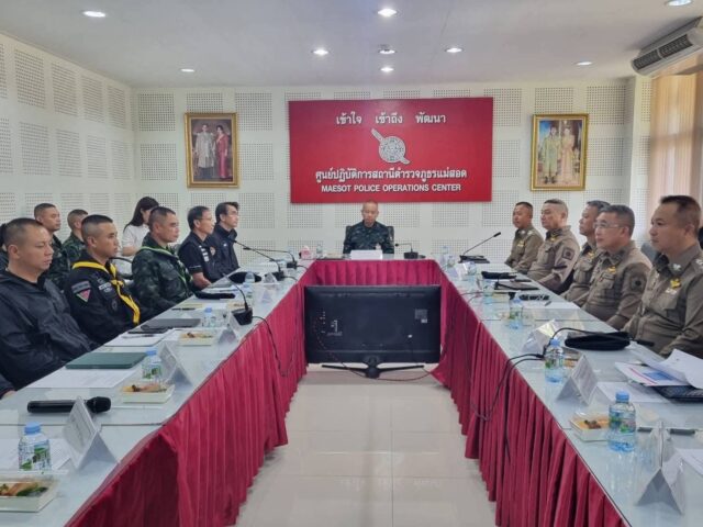 ณ ห้องประชุม ศปก.สภ.แม่สอด อ.แม่สอด จ.ตาก พล.ต. ไมตรี ชูปรีชา ผู้บัญชาการกองกำลังนเรศวร เป็นประธานในการประชุม พร้อมด้วย พล.ต.ต. ณัฐวุฒิ ภาคภูมิ รองผู้บัญชาการตำรวจภูธรภาค 6 พล.ต.ต. ไพศาล นันตา ผู้บังคับการตำรวจภูธรจังหวัดตาก พ.ต.อ. รัง ดาวดึงษ์ ผู้กำกับการสถานีตำรวจภูธรแม่สอด พ.อ. ชนกานต์ แสงศร ผู้บังคับหน่วยเฉพาะกิจ กรมทหารราบที่ 4 (ราชมนู) พ.ต.ท. ยศสรัล หิรัญวัฒนาชัย สารวัตรสถานีตำรวจท่องเที่ยว 3 กองกำกับการ 3 กองบังคับการตำรวจท่องเที่ยว พร้อมด้วยหน่วยงานที่เกี่ยวข้อง ได้แก่ ผกก.สภ.พบพระ, ผกก.สภ.แม่ระมาด, ผบ.ฉก.กรมทหารพรานที่ 35, ผกก.กก.2 บก.สอท.4, ผบ.ร้อย ตชด.346 และหัวหน้าหน่วยป้องกันและปราบปรามการค้ามนุษย์และเจ้าหน้าที่จาก กสทช.