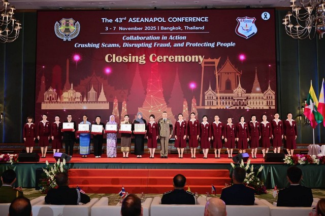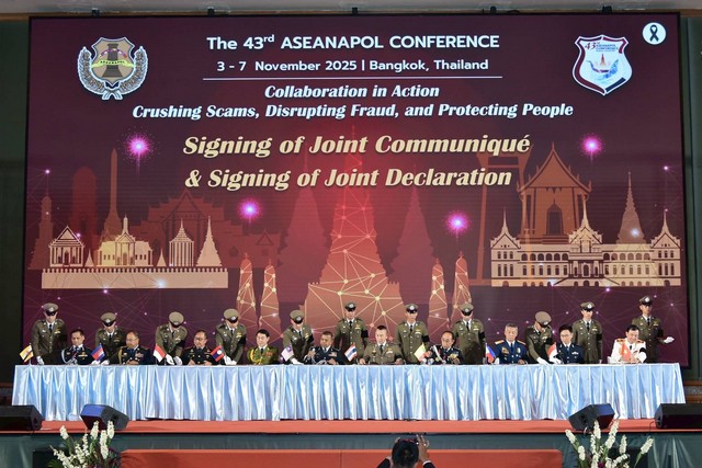 ปิดการประชุมหัวหน้าตำรวจอาเซียน ครั้งที่ 43 10 ประเทศสมาชิกลงนามแถลงการณ์ร่วมปราบปรามอาชญากรรมข้ามชาติ และรับรองปฏิญญากรุงเทพฯ ปราบสแกมเมอร์และการค้ามนุษย์